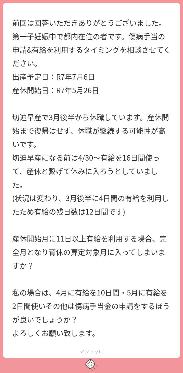 そのため産休に入る5月と4月で2回に分けて有給休暇を使って、残りの日は傷病手当金を受給するのが良いと解説しました。