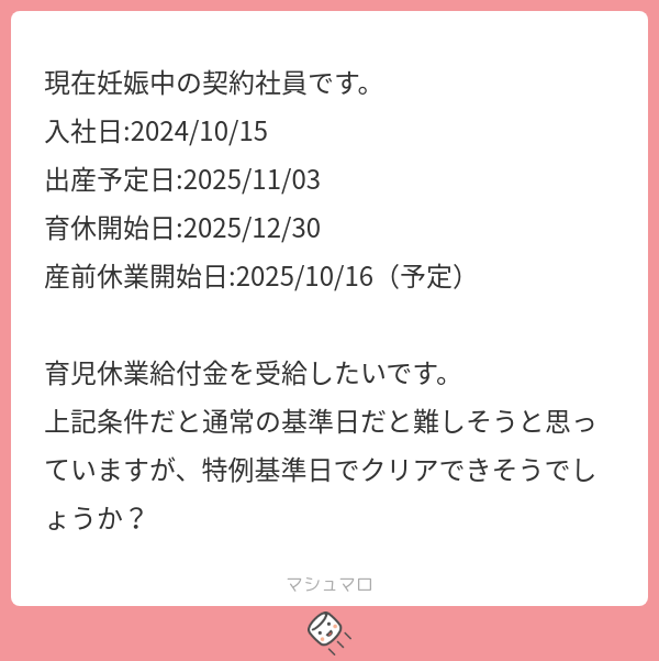 入社1年目で出産することになったけど、特例基準日なら条件クリアできそう。認識あってる?